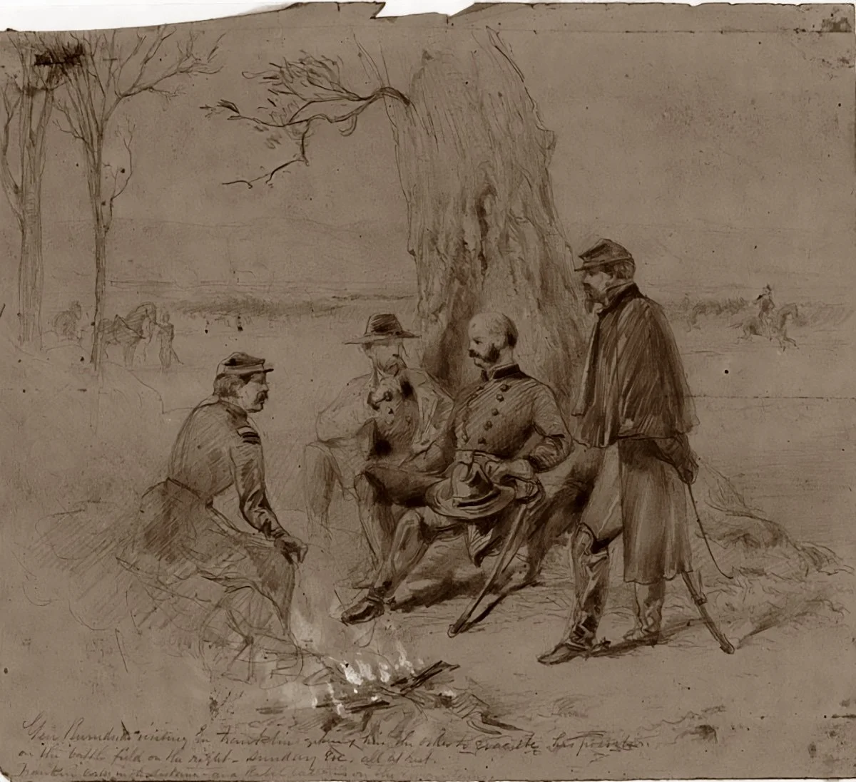 An Alfred Waud drawing of General Burnside visiting General Granklin giving him order to evacuate his position on the right. (Library of Congress)